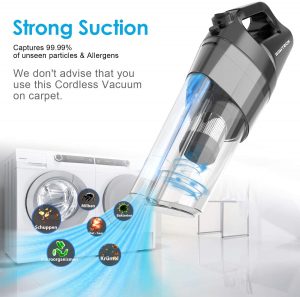 Con 4000mAh Lithium-ion Battery Tor – Mayor capacidad de la batería, la aspiradora compacta puede funcionar continuamente hasta 35 minutos con una sola carga.