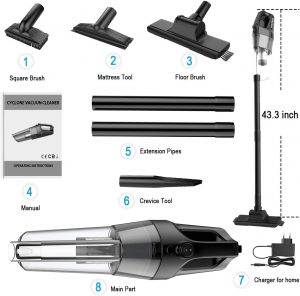 La aspiradora de mano ONEDAY inalámbrica sin bolsa le permite usarla en cualquier lugar. La aspiradora de mano inalámbrica sin bolsa le permite usarla en cualquier lugar. Los accesorios incluyen 1 cepillo de suelo 1 cepillo de colchón 1 cepillo cuadrado 1 boquilla de hendidura 2 tubos de extensión.